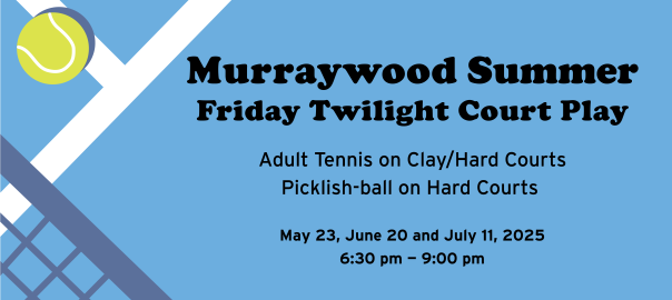 Join us on the following Fridays for casual, player-arranged tennis and pickle ball: Friday, May 23, Friday, June 20, and Friday, July 11 from 6:30 to 9:00pm. There is no charge for this event: All members, including Pool Members, may participate for free! Sponsored guests (those who come with a member) are also welcome at no charge!