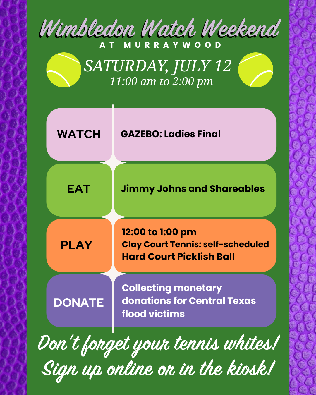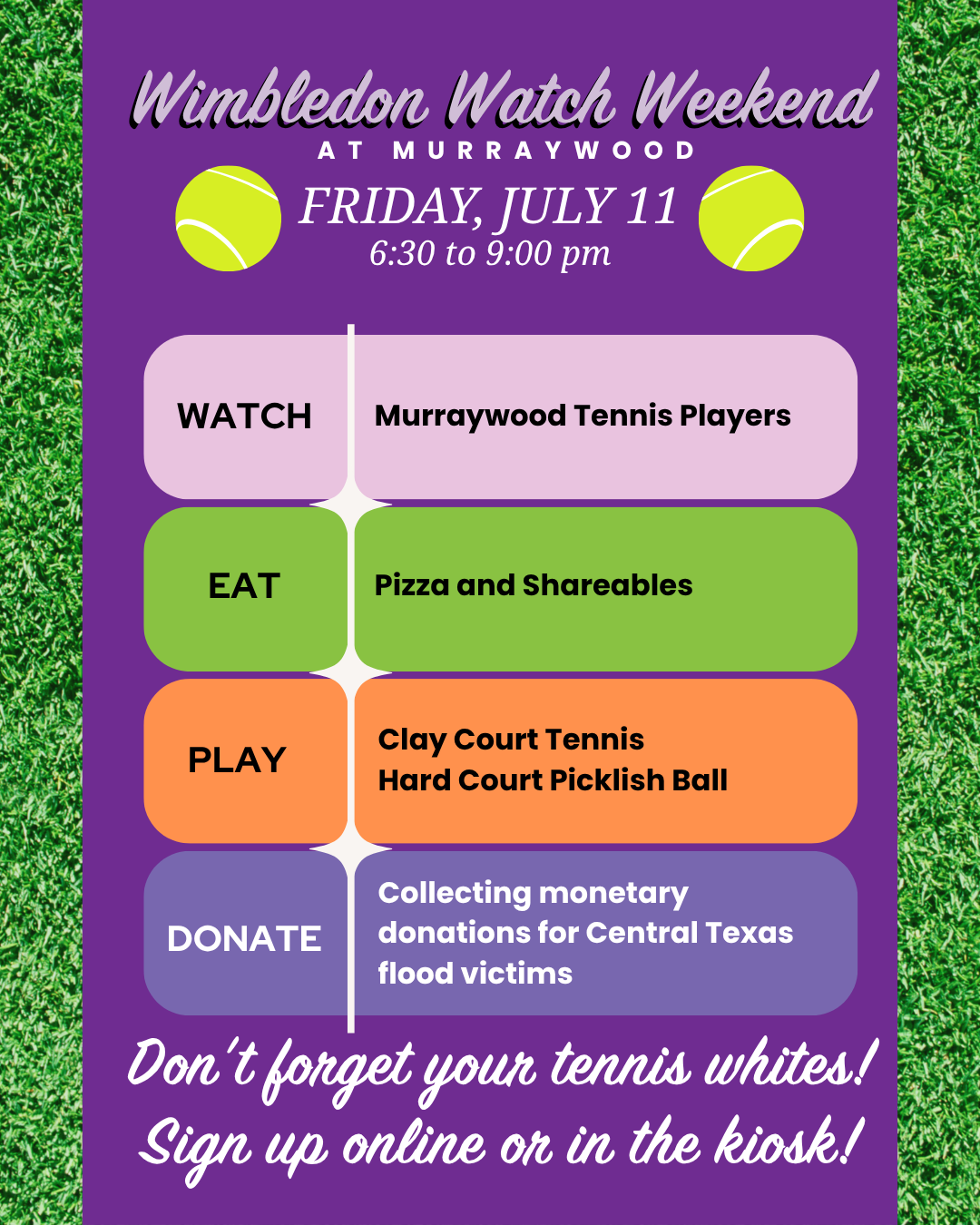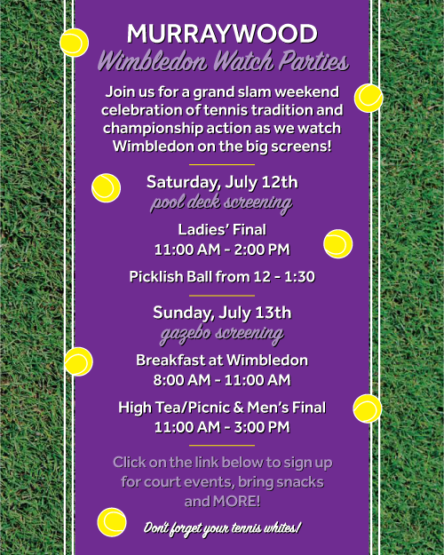 We are also having events on the courts and at the pool for all members and their guests! Tennis! TV – you know, Wimbledon Watching! Food! Fun! Fraternizing!